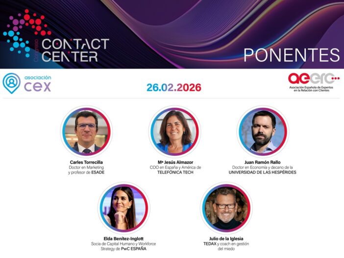 Madrid, 1 de octubre de 2025.- Por quinto año consecutivo, la Asociación CEX, y La Asociación AEERC celebran el Congreso Contact Center, un evento de referencia para inspirar a los líderes de la industria y poder compartir las mejores … [Leer más...] acerca de El Congreso Contact Center 2026 pondrá el foco en el cliente como motor de crecimiento